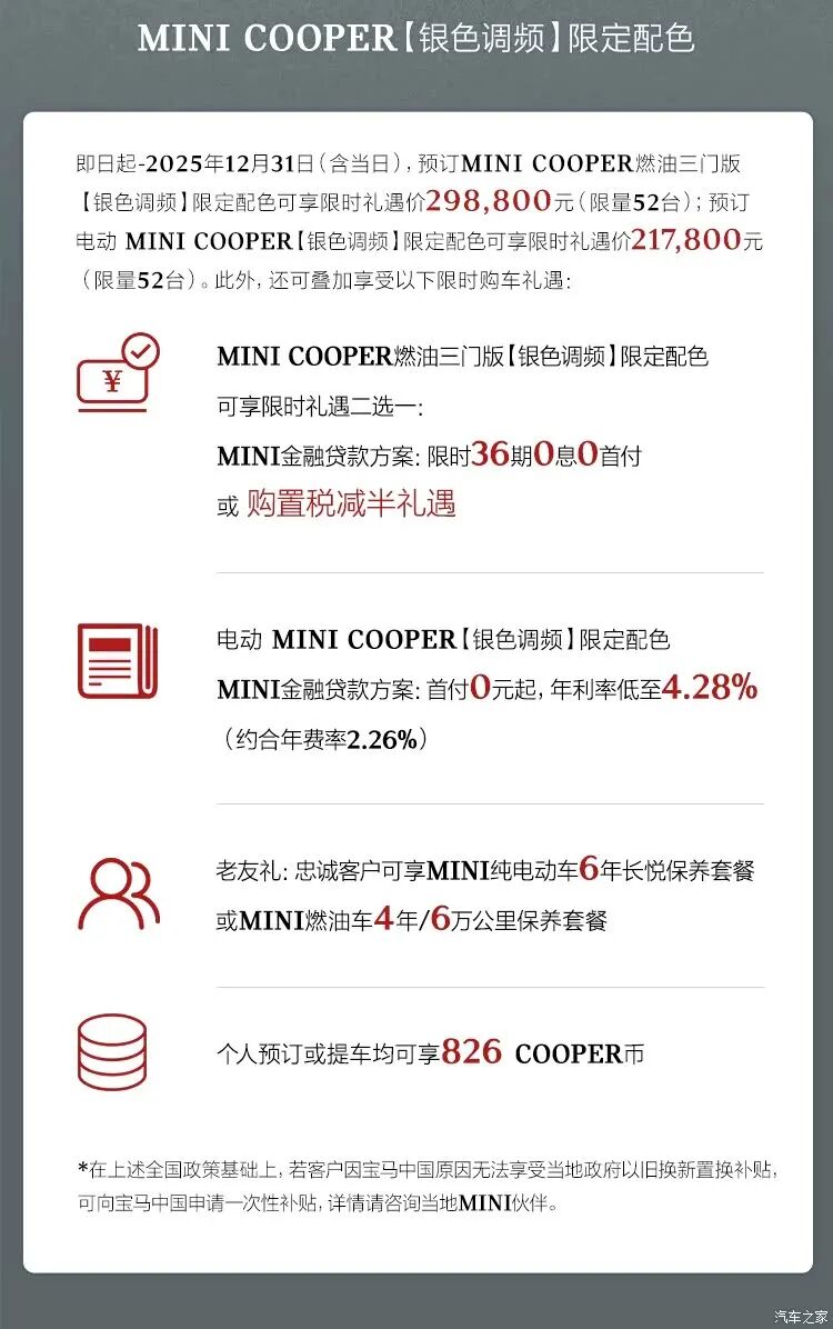 日前,咱们从官方获悉,MINI COOPER银颜色频范围版精致上市,其中电动MINI COOPER限时礼遇价21.78万起、MINI COOPER燃油三门版限时礼遇价28.88万起。两款车型均限量52台,12月31日前购车可享36期0息0首付或购置税减半、4年/6万公里爱护套餐(燃油版);首付0元起年利率4.28%、6年长悦爱护套餐(电动版);以及826COOPER币等。