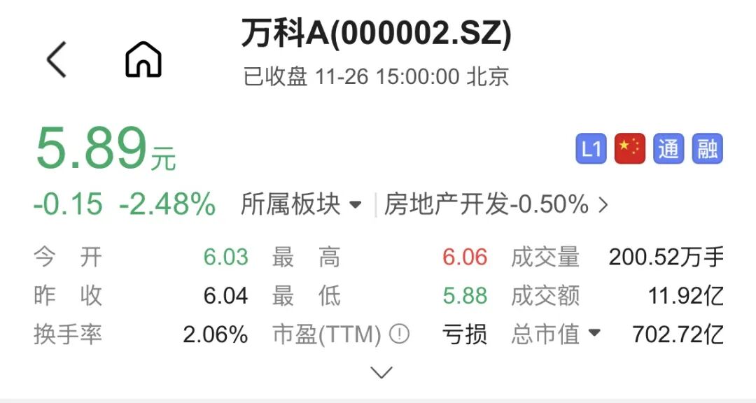 股价方面,万科A(000002.SZ)26日跌2.48%,报5.89元/股,股价创下10年新低,市值仅余702亿元。